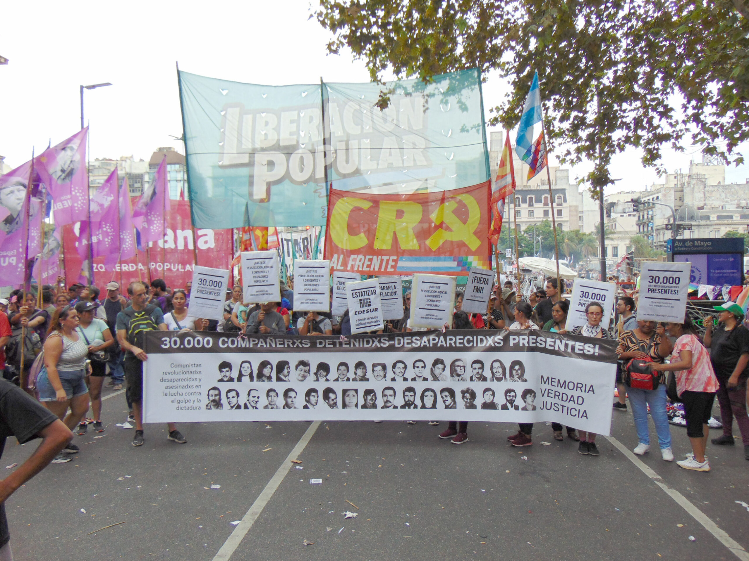 Desde el mediodía hasta el atardecer, siguió la enorme movilización de Abuelas, Madres Línea Fundadora y demás organismos históricos de Derechos Humanos. Allí estuvimos desde Liberación Popular y el CR, con nuestras banderas, reivindicando a los 30.000 detenidos-desaparecidos y a lxs 33 comunistas revolucionarixs detenidxs-desaparecidxs y asesinadxs en la lucha contra el golpe de estado y la dictadura. Por otra parte, a las 15hs realizó su acto la Asociación de Madres de Plaza de Mayo –conducida por Hebe Bonafini hasta su reciente fallecimiento– frente a su sede en Avenida Hipólito Yrigoyen 1584, con el eje “No a la proscripción Cristina conducción”.
