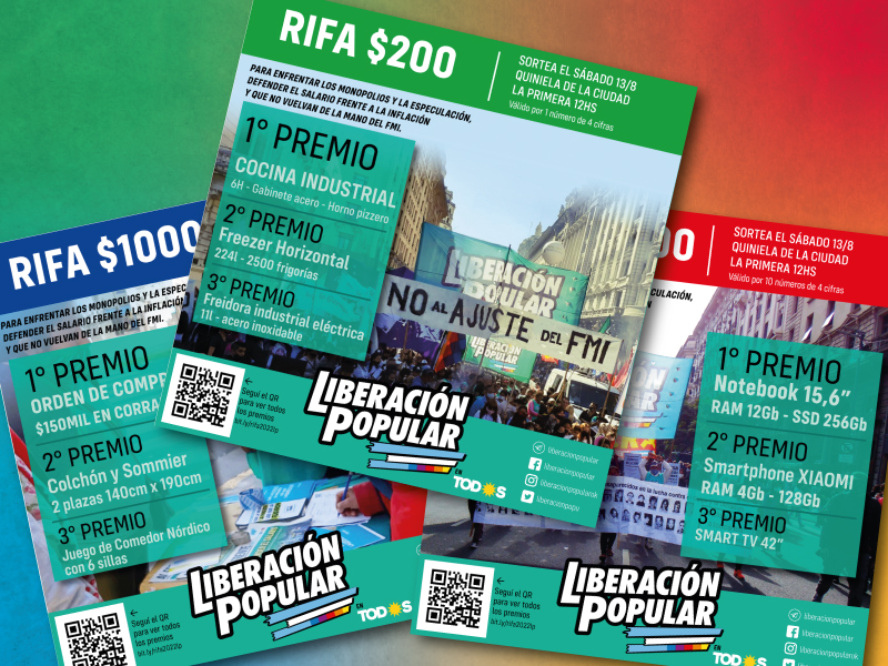 Venimos con experiencias muy positivas juntando fichas de afiliación y avales para obtener la personería jurídica de Liberación Popular. Nos proponemos dar un salto en este sentido aprovechando la rifa lugar por lugar. Tenemos rifas de $200, de $1000 y de $2000. Con tres rubros de premios y, este año, con muchos más premios. Se sortea el sábado 13/8, en La Primera a las 12hs por la Quiniela de la Ciudad.