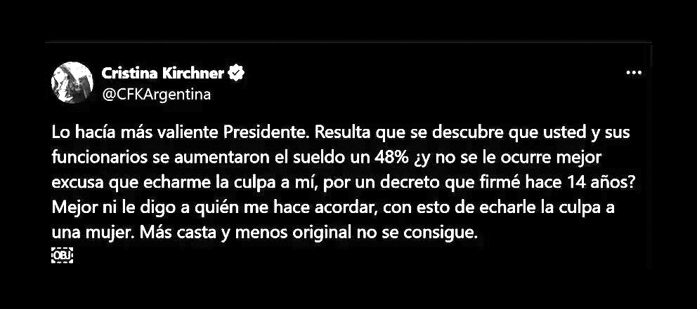 Finalmente, Milei debió anular el aumento del 48% que se había autoasignado a él y su gabinete; y echó a su secretario de Trabajo Omar Yasin responsabilizándolo por el “error”. Al conocerse el aumento, Milei primero había culpado a CFK por un decreto de 2010 y no se hizo cargo de haber firmado el aumento. “Lo hacía más valiente Presidente. Resulta que se descubre que usted y sus funcionarios se aumentaron el sueldo un 48% ¿y no se le ocurre mejor excusa que echarme la culpa a mí, por un decreto que firmé hace 14 años? (…)”, le respondió en X la ex presidenta.
