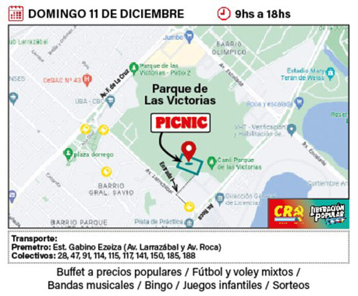 Esquivando las fechas del mundial, este domingo 11 de diciembre las y los compañerxs de Liberación Popular y el CR hacemos nuestro picnic de fin de año. Será una jornada para toda la familia, y a la cual se viene invitando a vecinos, compañerxs de estudio y trabajo, y a las fuerzas aliadas con quienes venimos compartiendo la lucha por un rumbo y una salida popular.